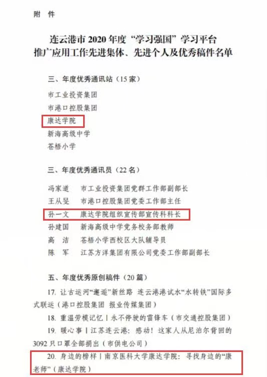 4月26日,在2020年度连云港市“学习强国”学习平台推广应用工作先进集体、先进个人及优秀稿件评选表彰工作中,我院荣获多项表彰,是全市唯一获得相关奖项的高校。其中,学院荣获年度优秀通讯站,组织宣传部孙一文荣获“年度优秀通讯员”;我院《身边的榜样丨南京医科大学康达学院:寻找身边的“康老师”》荣获“年度优秀原创稿件”。