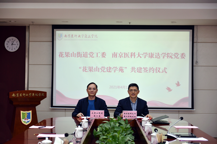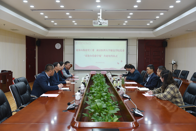 4月15日下午,我院与花果山街道党工委“花果山党建学苑”共建签约仪式在行政楼422会议室举行。花果山街道党工委书记蒋德恩等一行5人,院领导张鸿来、王磊出席会议。会议由党委副书记、副院长王磊主持。