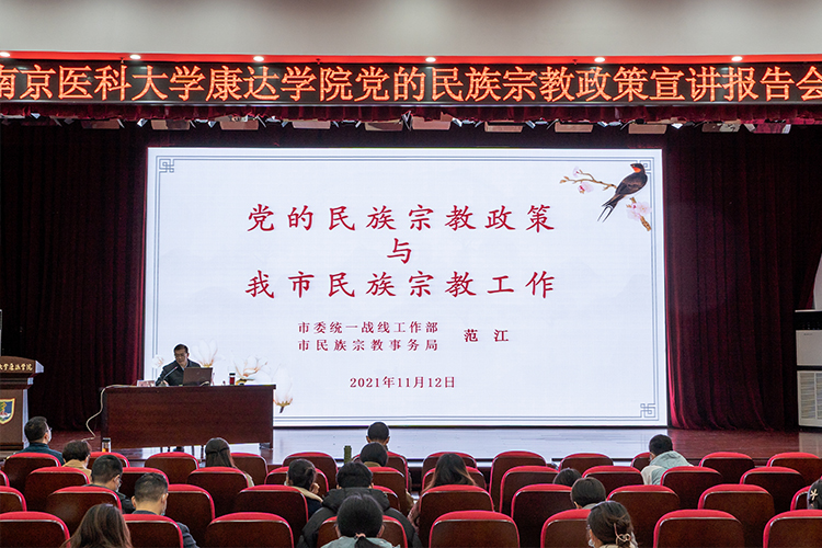 11月12日上午,我院在医政楼报告厅举办“党的民族宗教政策”宣讲报告会。市委统一战线工作部副部长、市民族宗教事务局局长、党组书记范江应邀作主题宣讲。院领导张鸿来、顾模进,党委组织宣传部相关同志,科级及以上干部、党支部书记、全体辅导员、讲师及以上教师、思政课教师等100余人参加报告会。活动由党委书记张鸿来主持。