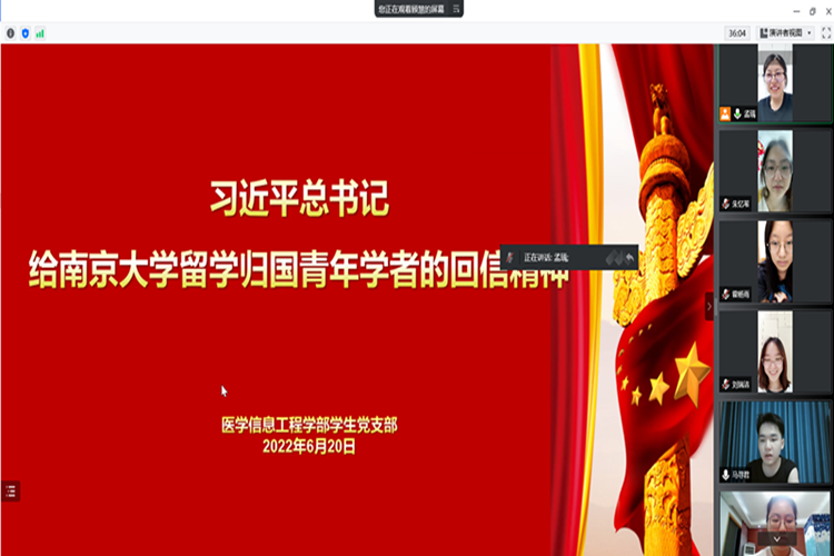 6月20日,医学信息工程学部学生党支部召开线上会议,专题学习习近平总书记给南京大学留学归国青年学者重要回信精神,医学信息工程学部学生党支部全体党员参加。