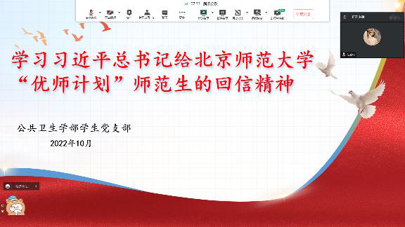 10月4日下午,公共卫生学部学生党支部以线上形式,举办“学习贯彻习近平总书记给‘优师计划’师范生重要回信精神”主题党日活动。本次会议由党支部书记赵晨曦老师主持,党支部全体党员参加此次会议。