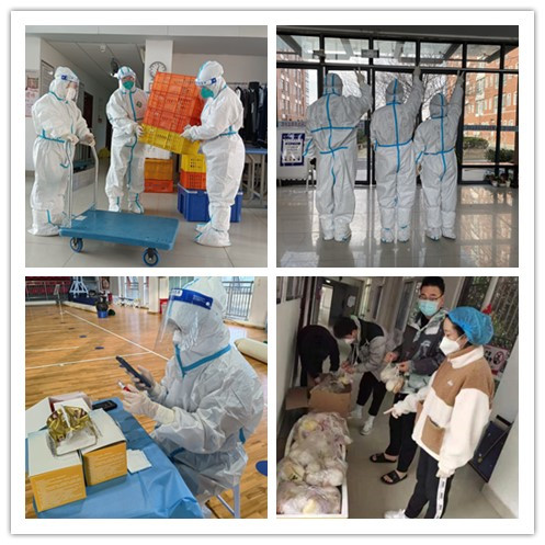 王宝乾和丁小莉两位同志负责楼宇管控组,统筹安排教职工志愿者上门为学生配送每日三餐。由于大部分宿舍没有电梯,同志们就一层一层抬上去,或是一手拎一袋。零下的天气里汗水流过脸颊,湿透了衣服,他们全然不顾,只希望脚步快一点,为得是让学生们能早点吃上美味热乎的饭菜。