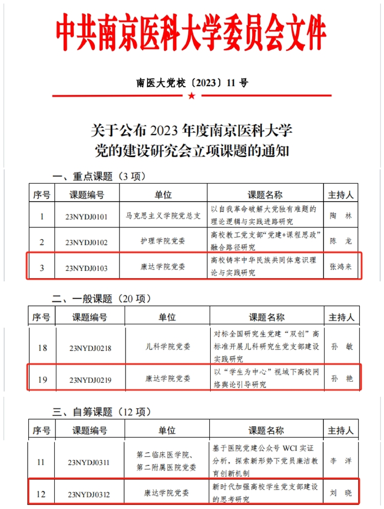 我院3项课题获2023 年度南京医科大学党的建设研究会立项