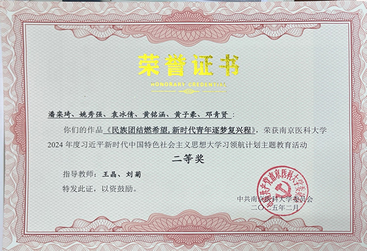 日前,南京医科大学发布《关于表彰2024年度习近平新时代中国特色社会主义思想大学习领航计划主题教育活动获奖作品及优秀指导教师的通知》。经学院推选、校级比赛,我院推选的作品《民族团结燃希望,新时代青年逐梦复兴程》荣获二等奖。