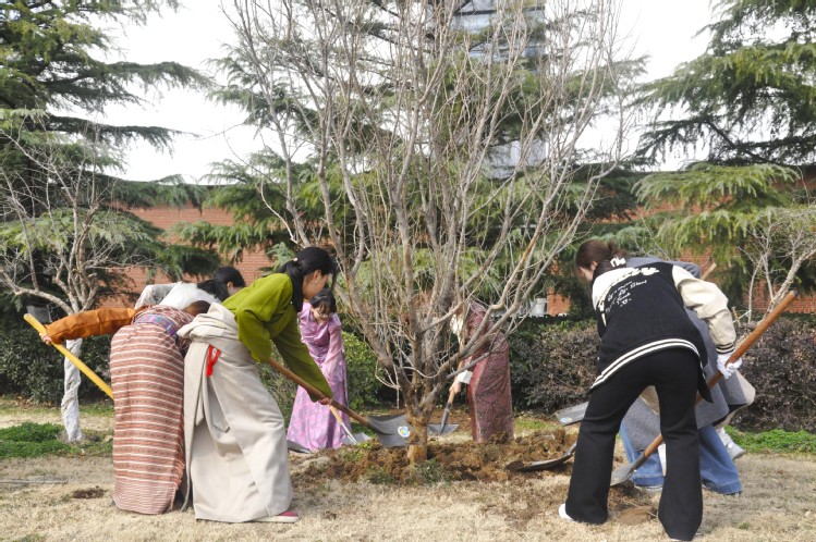 活动伊始,药学部学生党支部刘菊老师向在场师生详细介绍了南木林县的基本概况及双方合作开展情况,人文与管理学部的藏族学生代表就起源于南木林县的国家级非物质文化遗产湘巴藏戏进行了详细解说。随后,党委书记王兴东、党委副书记、副院长王磊与支部师生共同栽下南木林县赠送的石榴树,并为“同心树”揭牌。最后,藏族学生代表向在场的领导、老师们敬献由南木林县赠予的哈达。与此同时,南木林县第二完全小学的师生们也种下了学院赠送的象征民族团结的友谊之树。