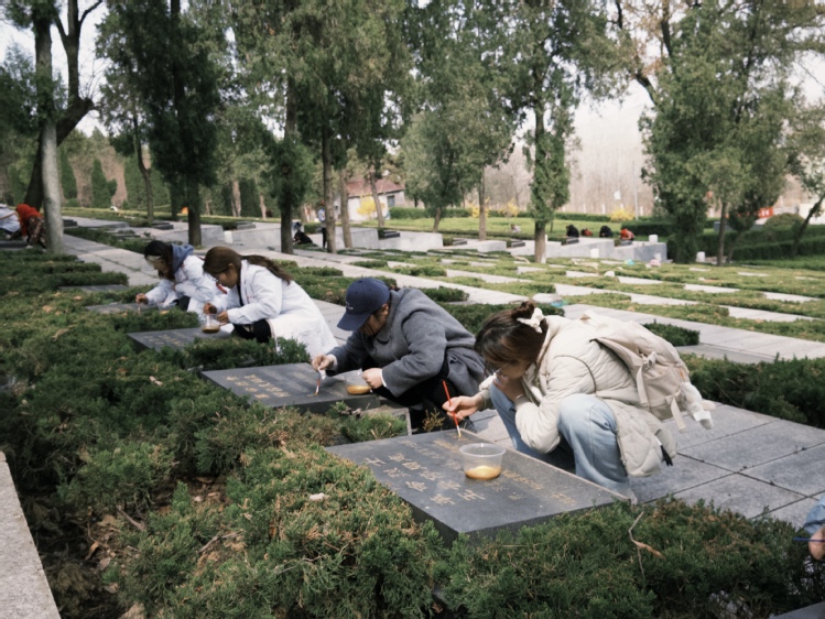 活动伊始,青年学子们合诵《不忘历史不惧未来》,表达了对先烈的追思与敬意。紧接着,师生党员代表神情庄重,手捧白菊,面向纪念碑默哀致敬。参与活动的师生为陵园内600座墓碑“描红”,填补碑文。人文与管理学部学生党支部书记王美玲讲述了战地医者夏云超的事迹,借微党课和描红实践,激发学生爱国热情。活动期间,学生急救队志愿者也充分发挥自身的专业优势,为前来祭扫的群众测量血压、血糖,并教授心肺复苏技巧。