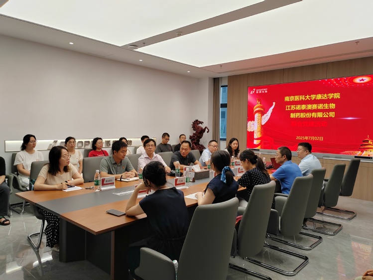 在诺泰生物会议室举行的座谈会上,诺泰澳赛诺公司党委书记孙建军介绍了企业党建与业务融合的成果,并表达了深化校企合作的意愿。我院药学部党支部书记杨明利介绍了学部概况和党建工作特色。双方围绕支部建设、人才培养、实习带教等议题展开热烈讨论,并就共建实习基地、师资互聘等达成初步意向。副院长张怀平指出,校企合作是培养应用型人才的关键,未来将继续深化校政企合作,共谋药学人才培养与产业发展新路径。