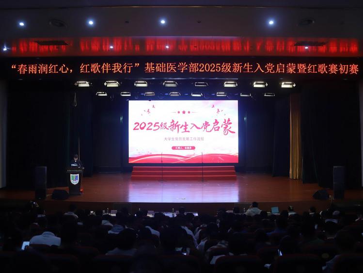 为纪念中国人民抗日战争暨世界反法西斯战争胜利80周年,培养新时代青年学生的爱国情怀,10月22日至23日,临床、基础医学部学生党支部在大礼堂开展2025级新生入党启蒙教育暨“春雨润红心,红歌伴我行”红歌赛初赛。支部书记陶嫄,支部全体教师党员,特邀嘉宾韩婷婷、陈天乐以及基础医学部2025级全体新生参加活动。