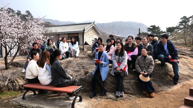 锦屏山桃花涧作为连云港市“人文启思”研学路线的重要节点,兼具自然景观与人文底蕴。本次活动串联山门广场、将军崖岩画、天书广场、桃林溪谷等点位开展研学。支部书记顾金媛现场讲授微党课,以将军崖岩画(东夷文化遗存)为切入点阐释文化自信内涵,引导党员师生思考传统文化传承与阅读推广的融合路径;在桃林溪谷,党员师生开展读书分享,围绕经典诗词与红色文学交流体悟,在春景书香中砥砺初心。